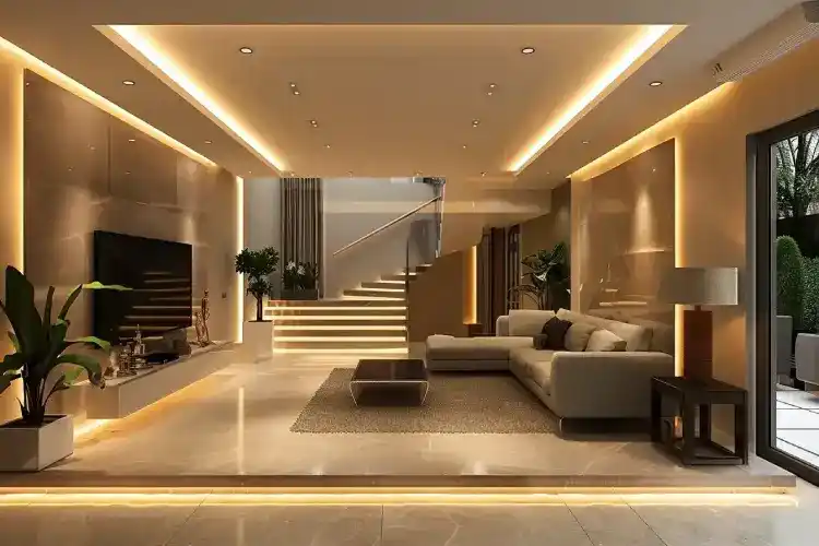 Двух- и многоуровневые создают зонирование и сложный рельеф за счёт алюминиевых/ПВХ-каркасов. Теневой профиль формирует аккуратный «разрыв» 5–8 мм без плинтуса. «Парящий» — подсветка в зазоре по периметру. Световые линии — встроенные профили с LED для графичных схем. Контурная подсветка идёт по периметру стен, а «подсветка внутри» использует светопрозрачное полотно, дающее мягкий равномерный свет по всей площади.